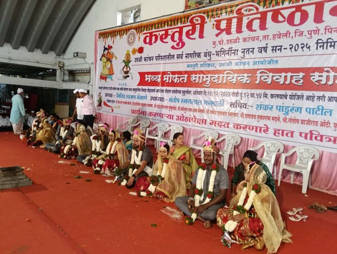 उरूळी कांचन येथील कस्तुरी प्रतिष्ठाने भव्य मोफत सामुदायिक विवाह सोहळ्याचे आयोजन केले होते. यावेळी सोहळ्यात पाच विवाह संपन्न झाले .हा विवाह सोहळा अतिशय नियोजनबध्द पध्दतीने पार पाडून प्रार्थना करणाऱ्या ओढां पेक्षा मदत करणारे हात पवित्र असतात हे समाजापुढे चांगले उदाहरण ठेवले आहे .या विवाह सोहळ्याची माहिती देताना प्रतिष्ठानचे अध्यक्ष
