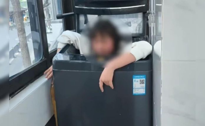 मशीन कापल्यानंतर चिनी मुलगी वॉशिंग मशीनमध्ये बसली
