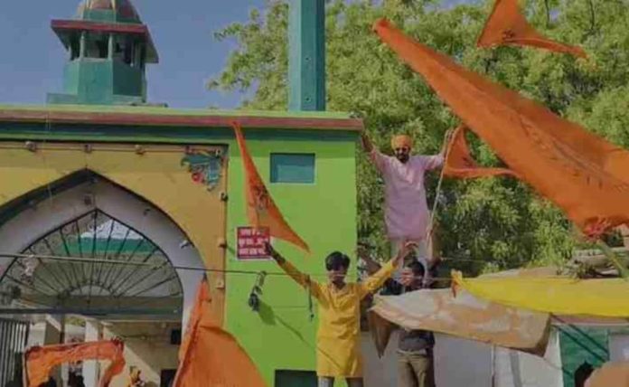 काही तरुणांनी प्रयाग्राजमध्ये केशर ध्वजासह दर्गाच्या गेटवर चढले, घोषणा केली.